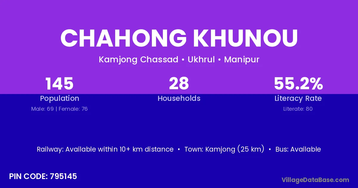Kamjong (25 km) is the nearest town to Chahong Khunou village for major economic activities and is located approximately 25 km away.