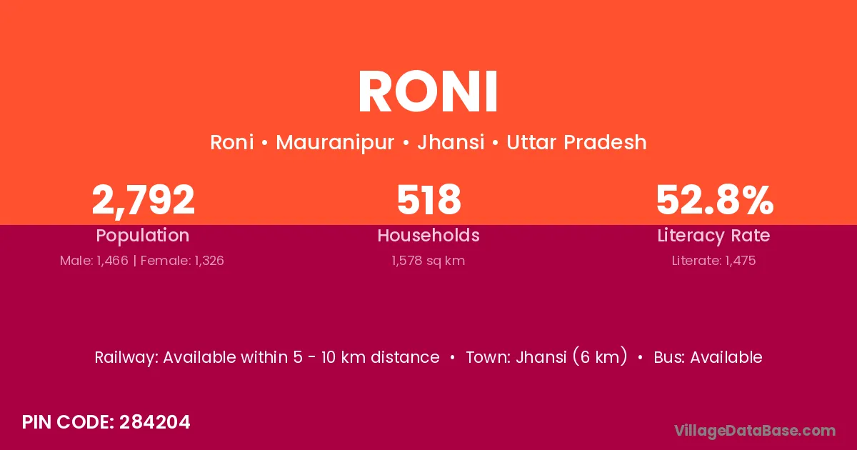Roni village has a total population of 206 people, of which 104 are males and 102 are females.
