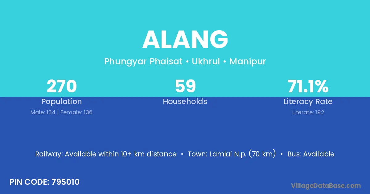 Lamlai N.p. (70 km) is the nearest town to Alang village for major economic activities and is located approximately 70 km away.