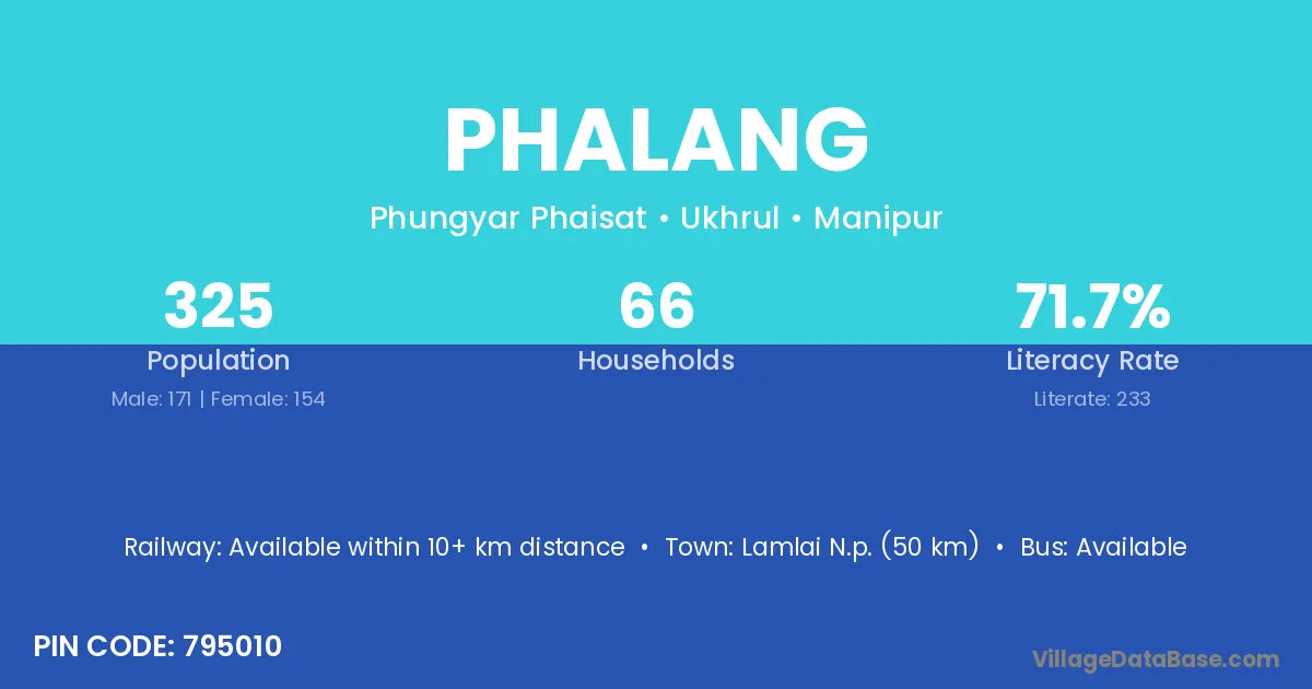 Lamlai N.p. (50 km) is the nearest town to Phalang village for major economic activities and is located approximately 50 km away.