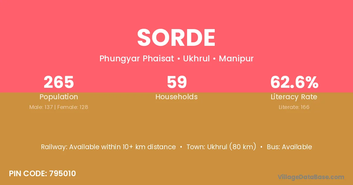 Ukhrul (80 km) is the nearest town to Sorde village for major economic activities and is located approximately 80 km away.