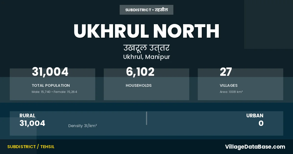 According to the 2011 census The total area of Ukhrul North Subdivision is 1008 km², with a population of 31004 people. The population density is 31 inhabitants per square kilometre, and there are approximately 6102 houses in the sub district.