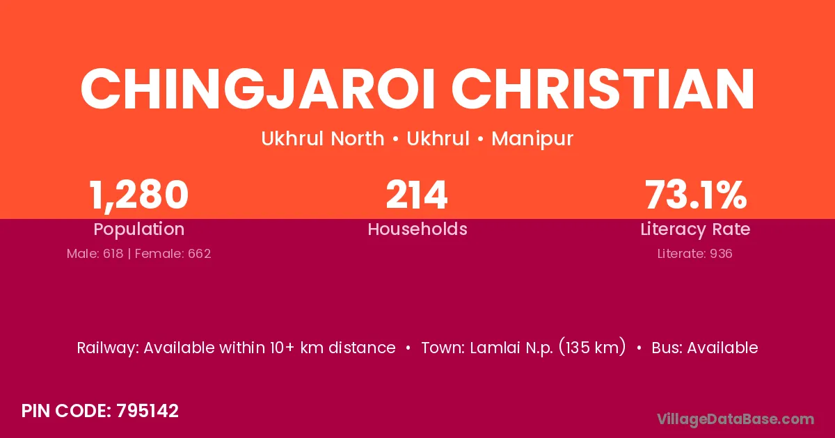 Chingjaroi Christian village has a total population of 1,280 people, of which 618 are males and 662 are females.