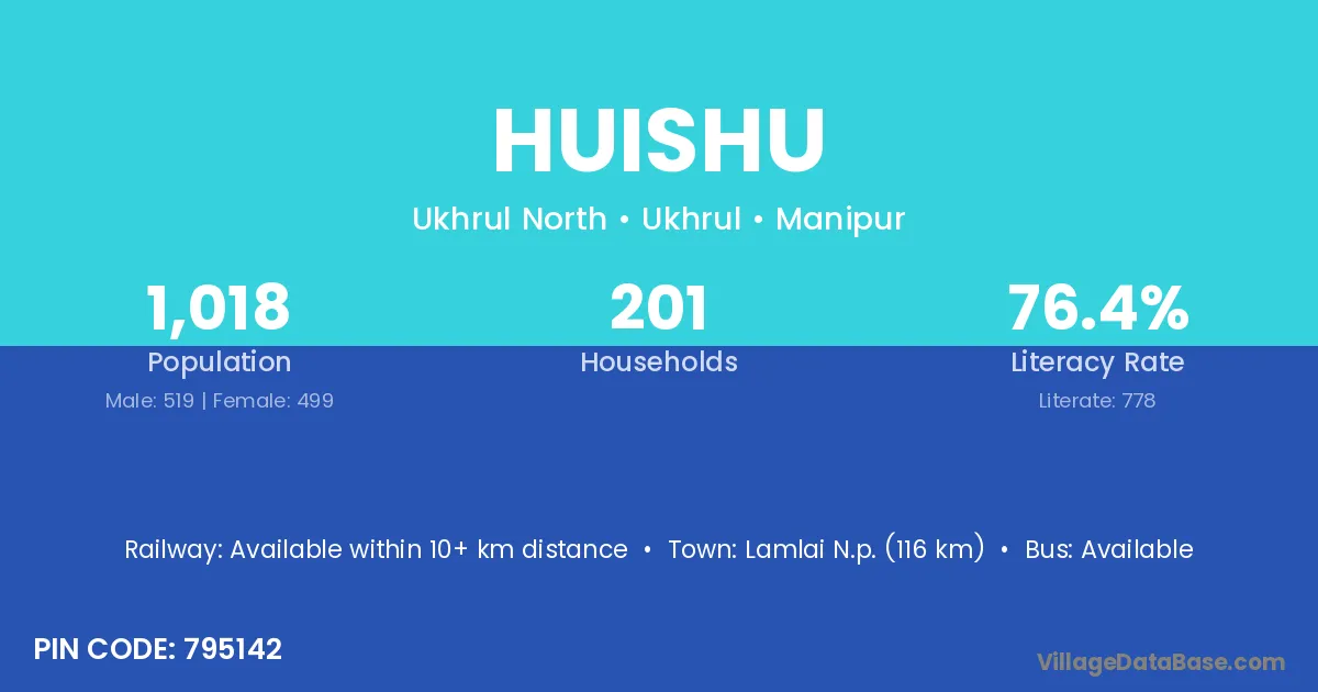 Lamlai N.p. (116 km) is the nearest town to Huishu village for major economic activities and is located approximately 116 km away.