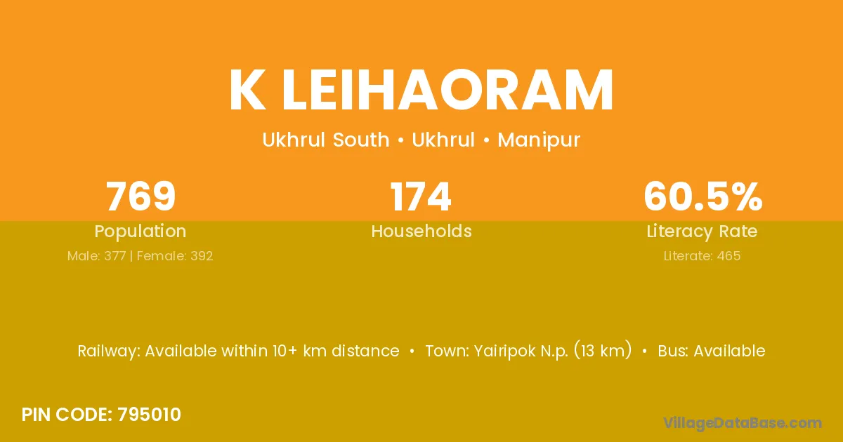 Yairipok N.p. (13 km) is the nearest town to K Leihaoram village for major economic activities and is located approximately 13 km away.