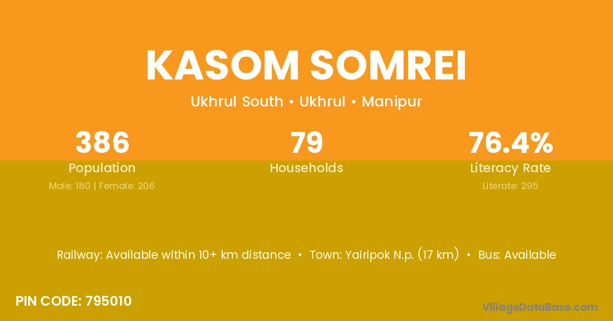 Yairipok N.p. (17 km) is the nearest town to Kasom Somrei village for major economic activities and is located approximately 17 km away.