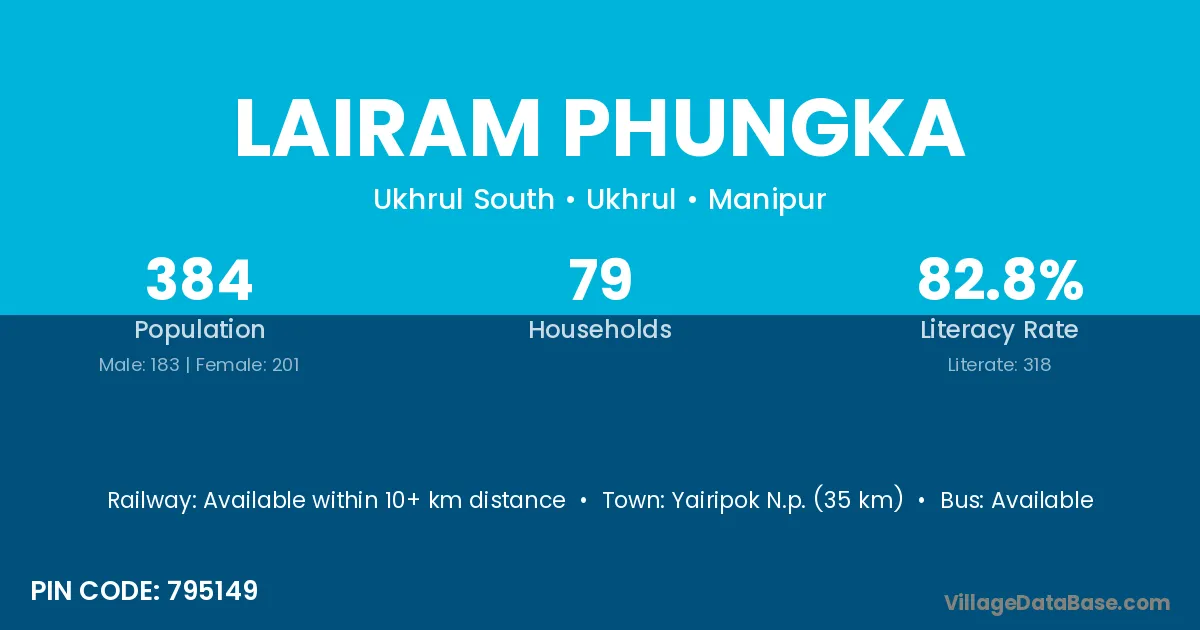 Yairipok N.p. (35 km) is the nearest town to Lairam Phungka village for major economic activities and is located approximately 35 km away.