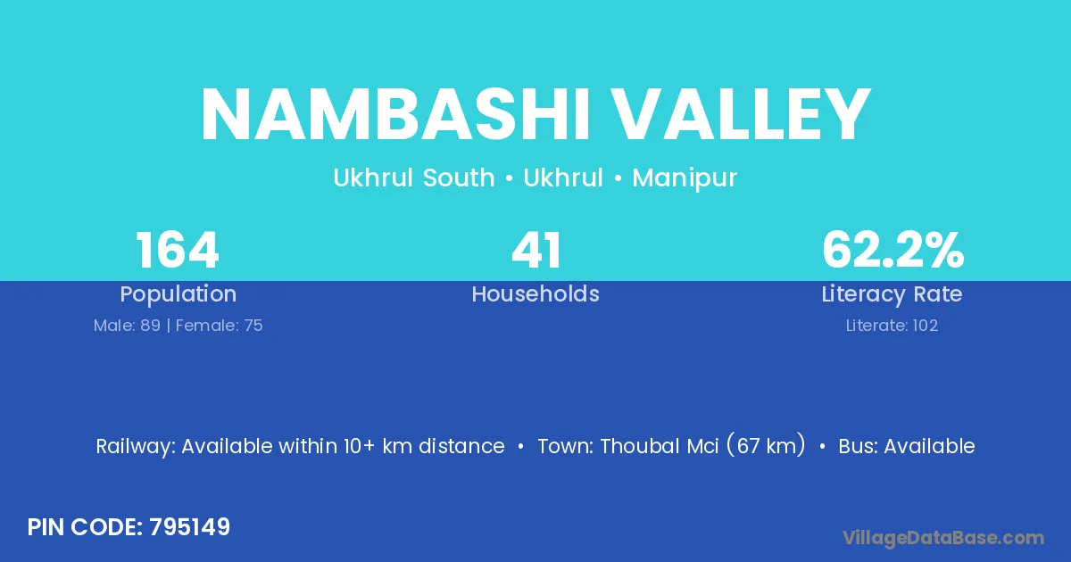 Thoubal Mci (67 km) is the nearest town to Nambashi Valley village for major economic activities and is located approximately 67 km away.
