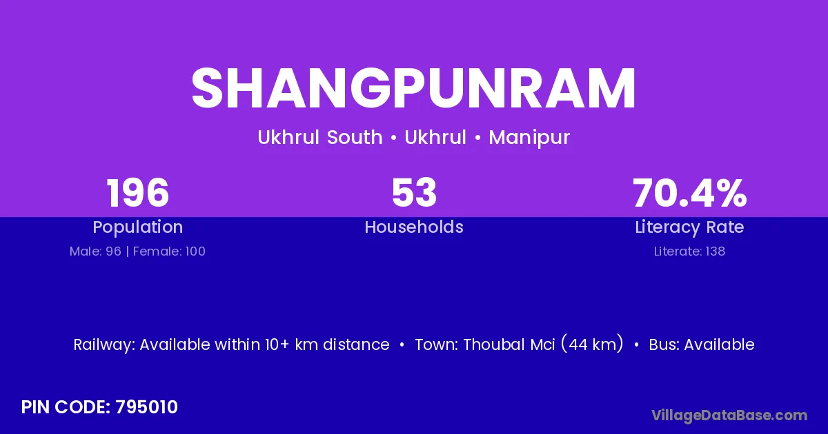 Thoubal Mci (44 km) is the nearest town to Shangpunram village for major economic activities and is located approximately 44 km away.