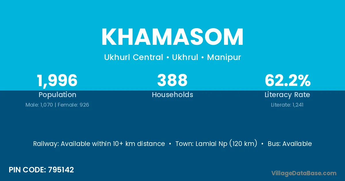 Lamlai Np (120 km) is the nearest town to Khamasom village for major economic activities and is located approximately 120 km away.