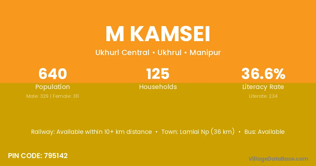 Lamlai Np (36 km) is the nearest town to M Kamsei village for major economic activities and is located approximately 36 km away.