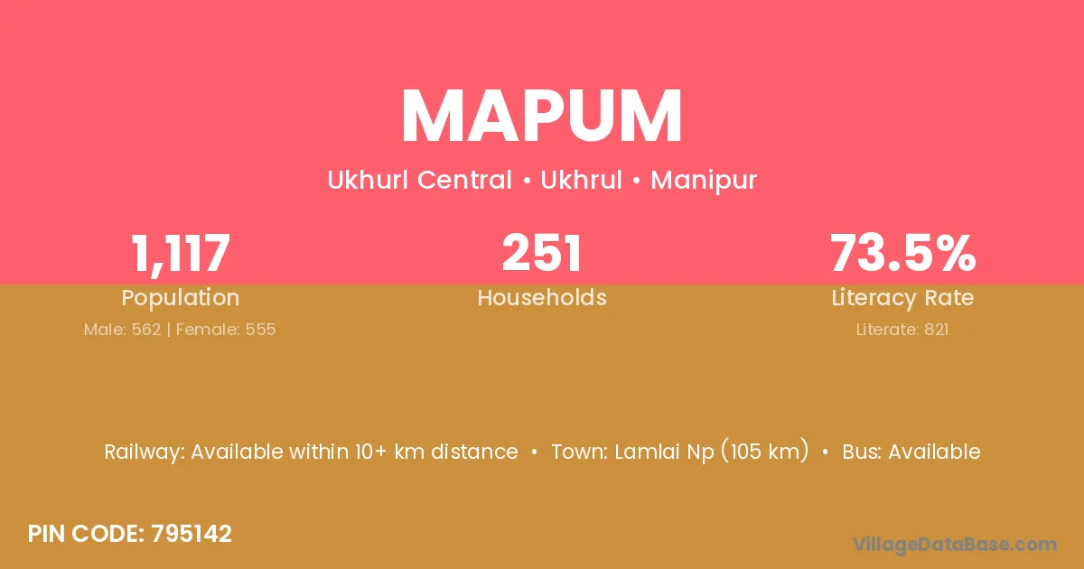 Lamlai Np (105 km) is the nearest town to Mapum village for major economic activities and is located approximately 105 km away.