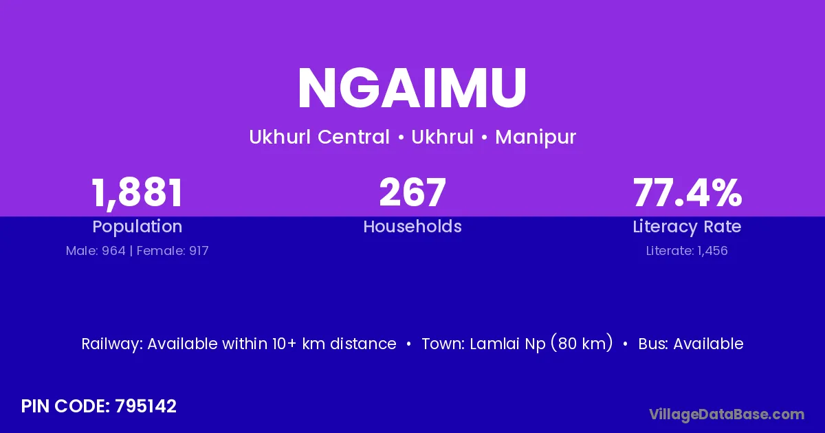 Lamlai Np (80 km) is the nearest town to Ngaimu village for major economic activities and is located approximately 80 km away.
