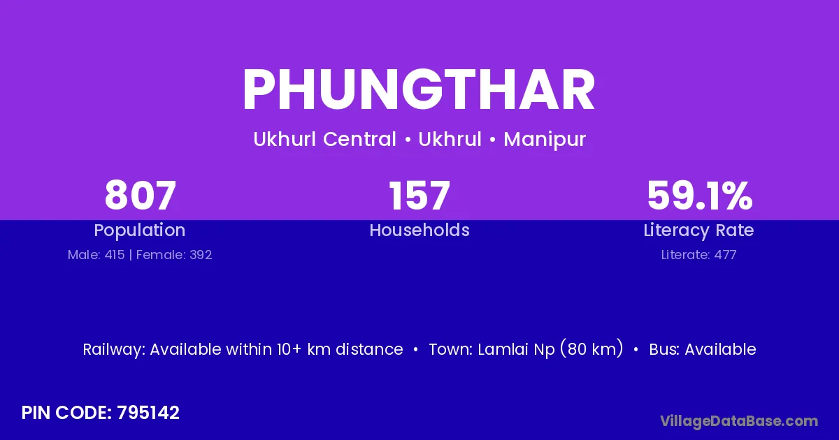 Lamlai Np (80 km) is the nearest town to Phungthar village for major economic activities and is located approximately 80 km away.