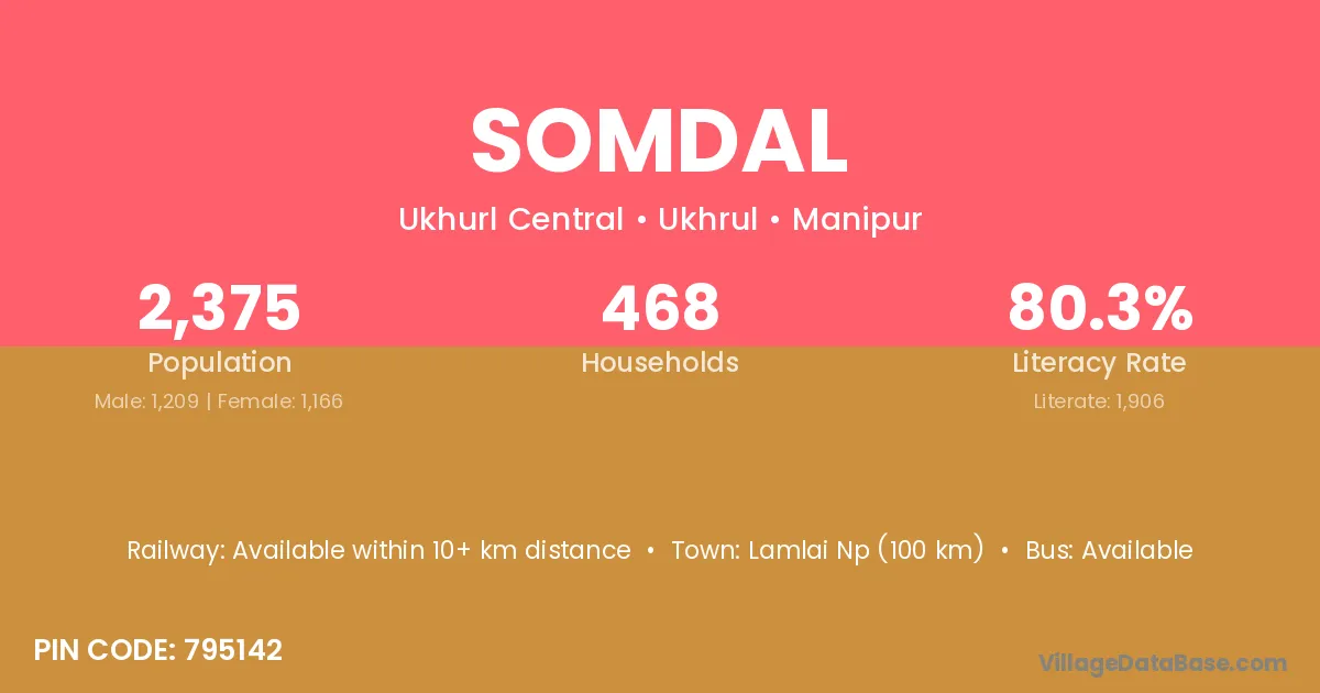 Lamlai Np (100 km) is the nearest town to Somdal village for major economic activities and is located approximately 100 km away.