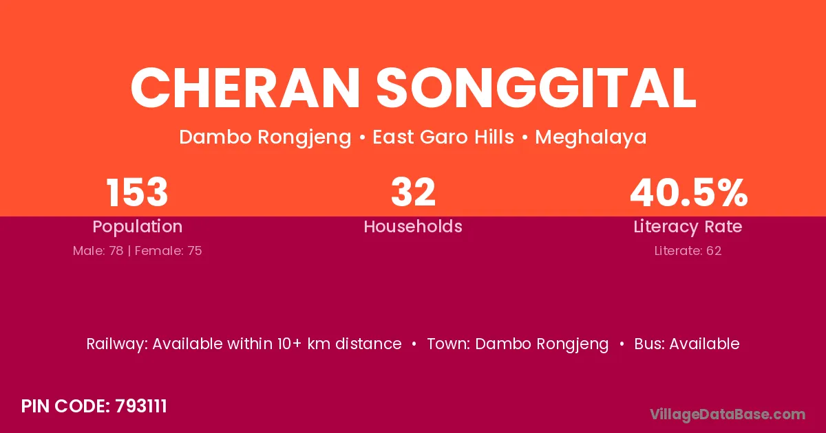 Cheran Songgital village has a total population of 153 people, of which 78 are males and 75 are females.