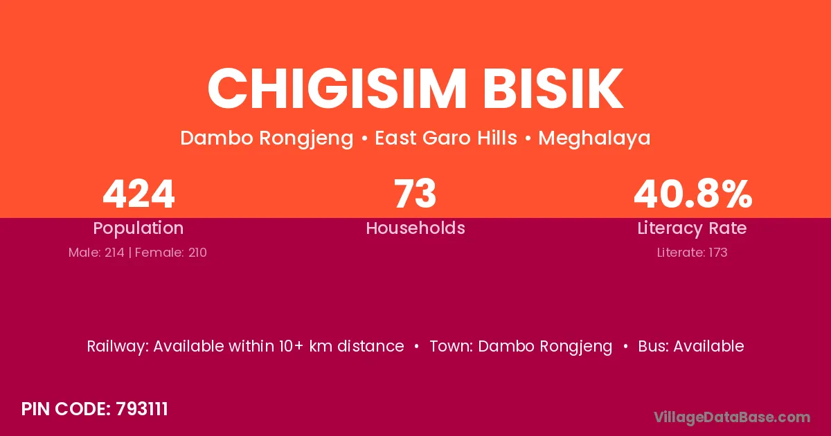 Chigisim Bisik village has a total population of 424 people, of which 214 are males and 210 are females.