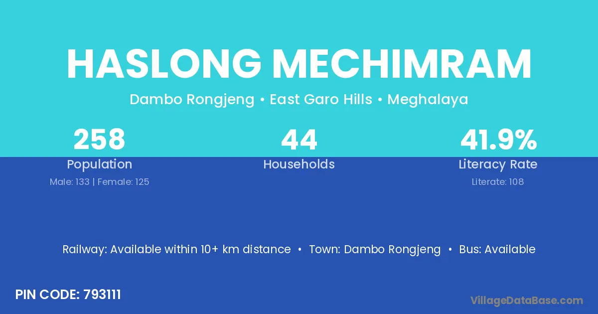 Haslong Mechimram village has a total population of 258 people, of which 133 are males and 125 are females.