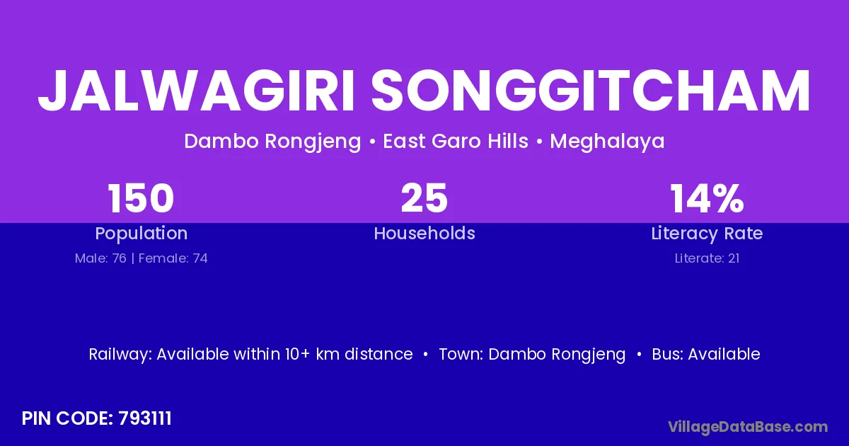 Jalwagiri Songgitcham village has a total population of 150 people, of which 76 are males and 74 are females.