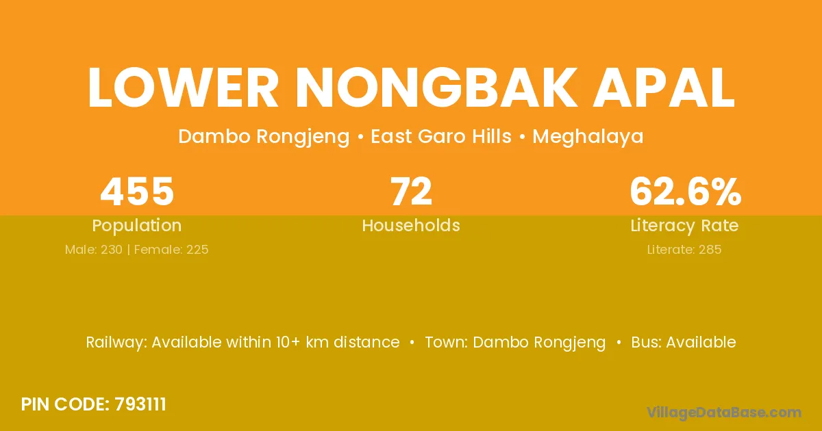 Lower Nongbak Apal village has a total population of 455 people, of which 230 are males and 225 are females.