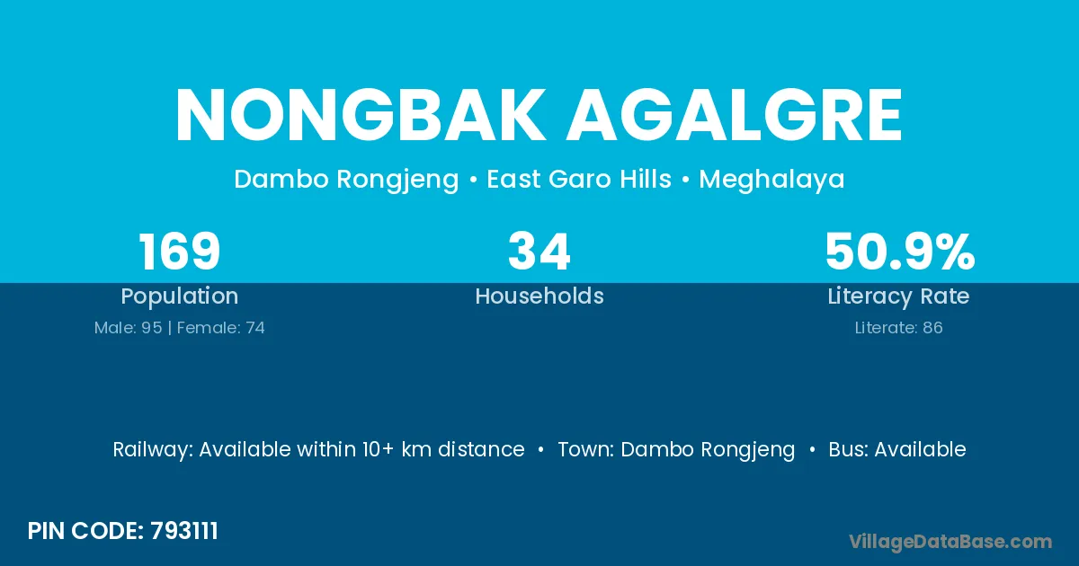 Nongbak Agalgre village has a total population of 169 people, of which 95 are males and 74 are females.