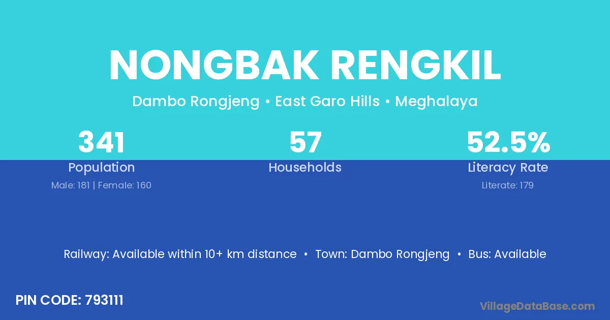 Nongbak Rengkil village has a total population of 341 people, of which 181 are males and 160 are females.