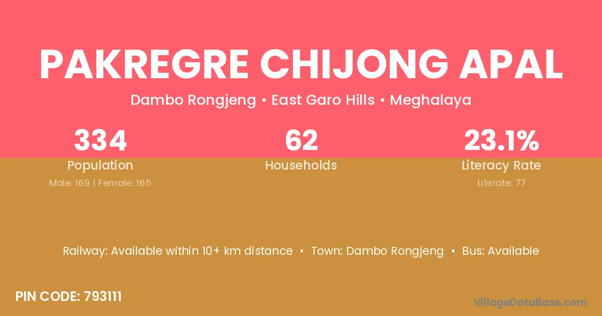 Pakregre Chijong Apal village has a total population of 334 people, of which 169 are males and 165 are females.