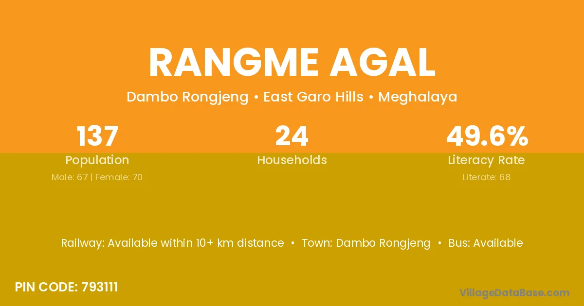 Rangme Agal village has a total population of 137 people, of which 67 are males and 70 are females.