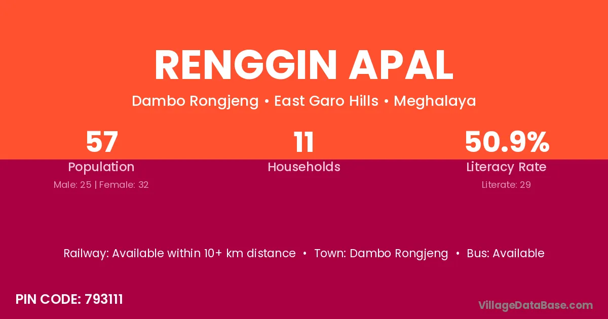 The literacy rate of Renggin Apal village is 50.88%. Male literacy stands at 60.00% and female literacy at 43.75%.