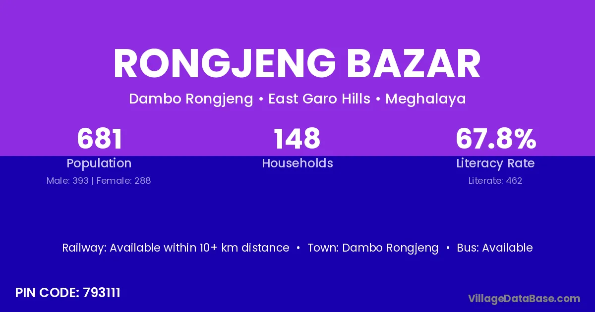 Rongjeng Bazar village has a total population of 681 people, of which 393 are males and 288 are females.