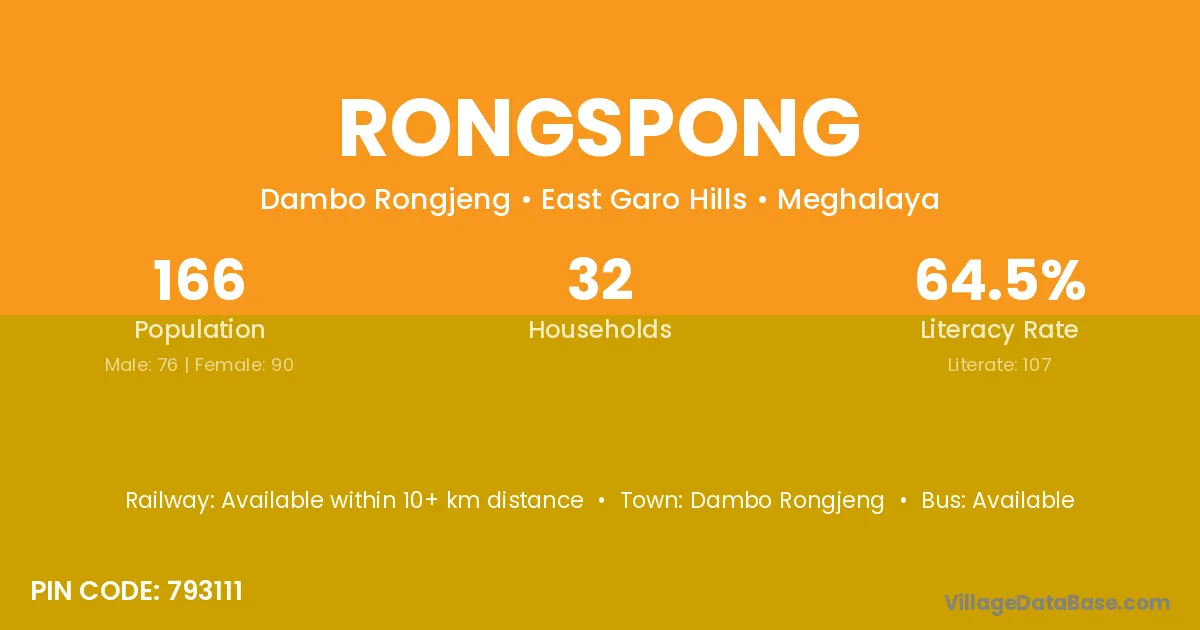 The literacy rate of Rongspong village is 64.46%. Male literacy stands at 68.42% and female literacy at 61.11%.