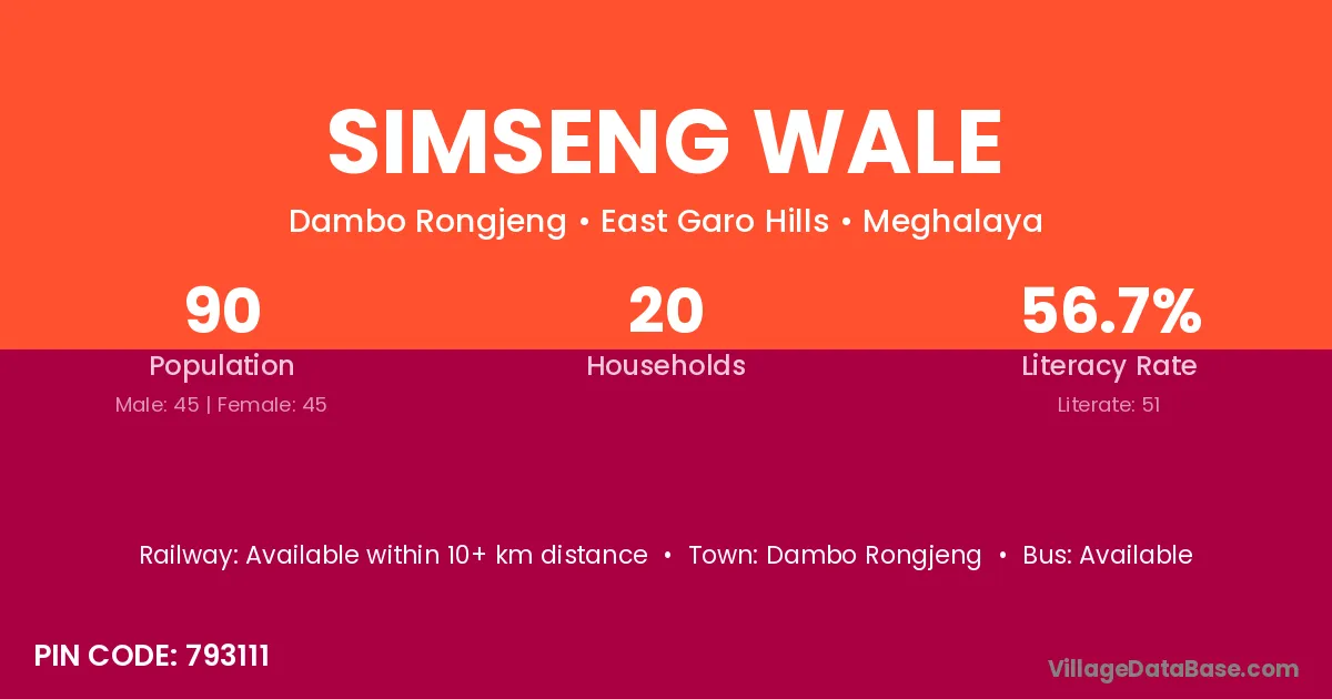 Simseng Wale village has a total population of 90 people, of which 45 are males and 45 are females.
