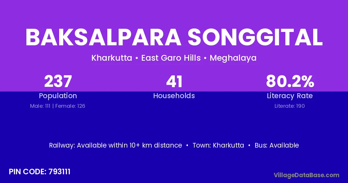 Baksalpara Songgital village has a total population of 237 people, of which 111 are males and 126 are females.