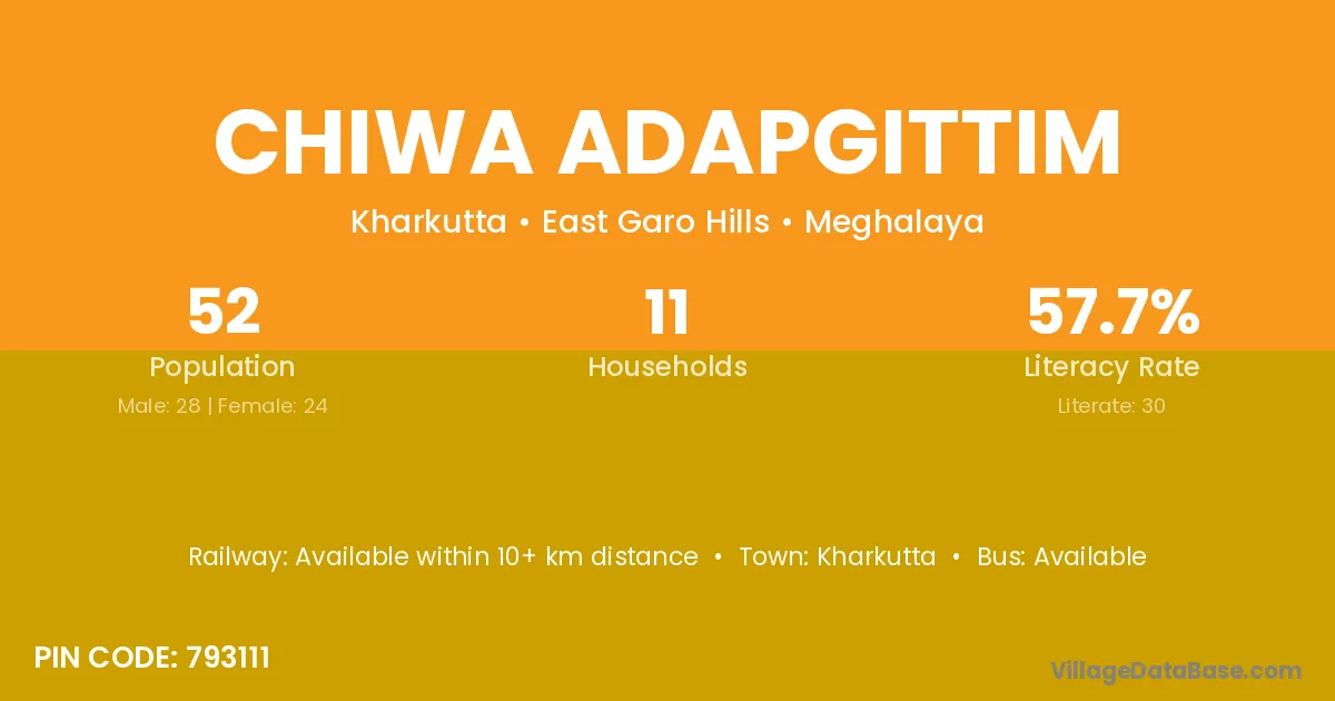 The literacy rate of Chiwa Adapgittim village is 57.69%. Male literacy stands at 50.00% and female literacy at 66.67%.