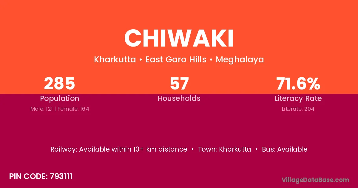 Chiwaki village has a total population of 285 people, of which 121 are males and 164 are females.