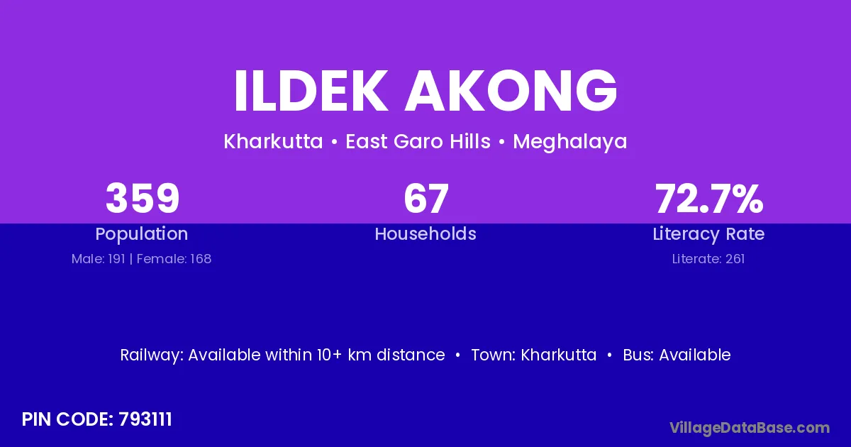 Ildek Akong village has a total population of 359 people, of which 191 are males and 168 are females.