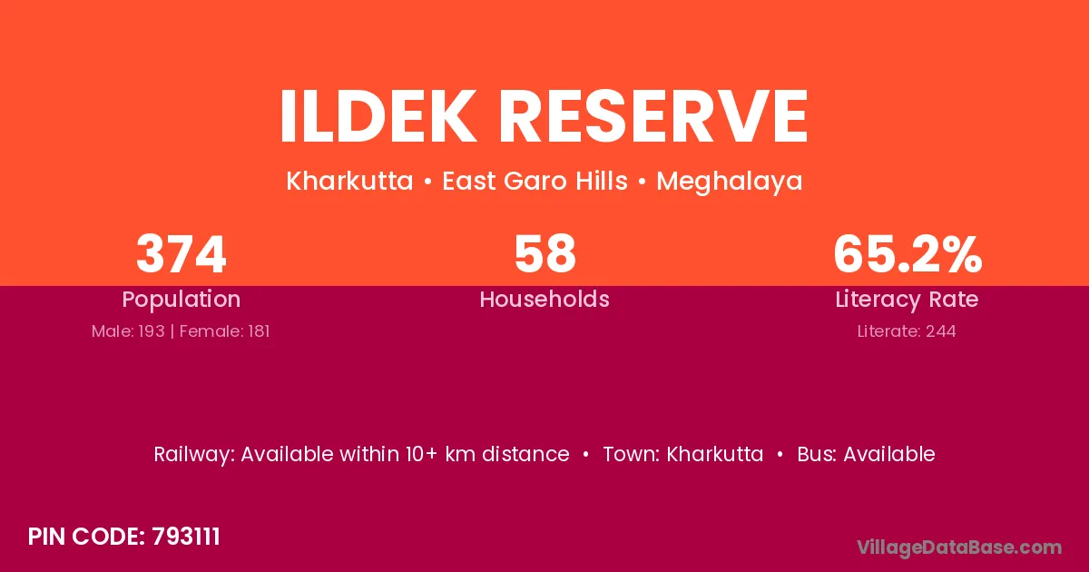 Ildek Reserve village has a total population of 374 people, of which 193 are males and 181 are females.