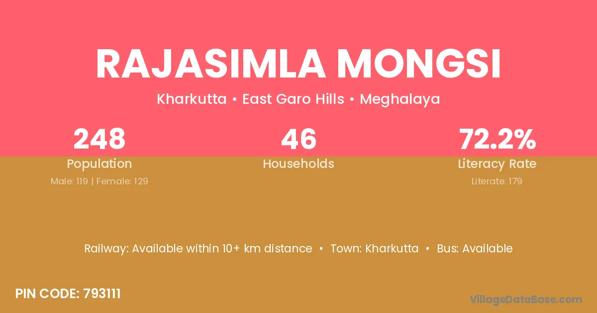 Rajasimla Mongsi village has a total population of 248 people, of which 119 are males and 129 are females.