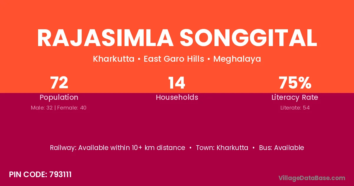 Rajasimla Songgital village has a total population of 72 people, of which 32 are males and 40 are females.