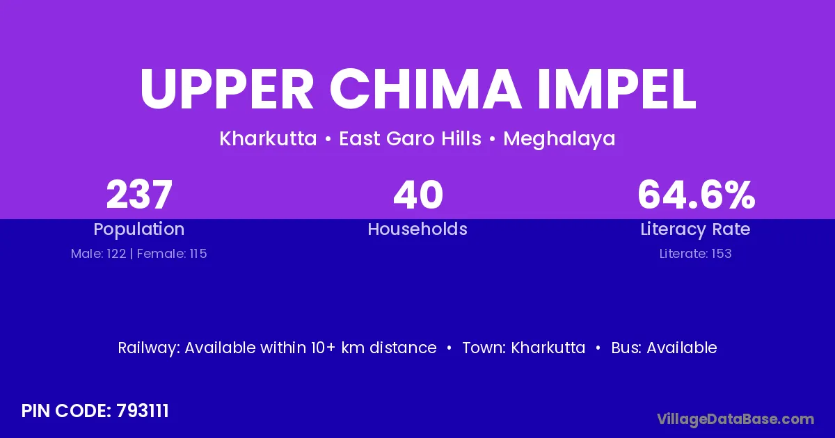 Upper Chima Impel village has a total population of 237 people, of which 122 are males and 115 are females.