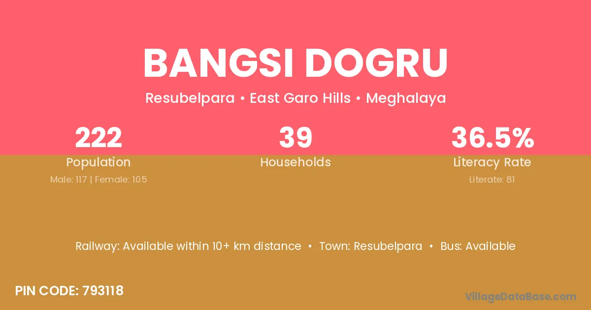 Bangsi Dogru village has a total population of 222 people, of which 117 are males and 105 are females.