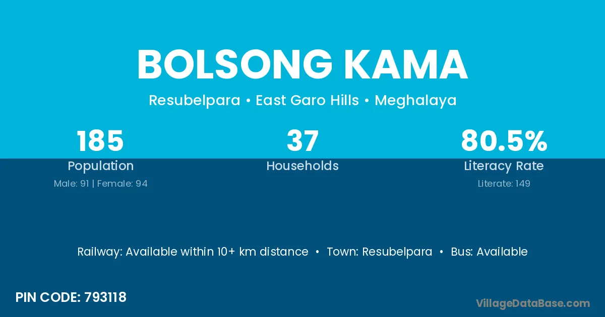 Bolsong Kama village has a total population of 185 people, of which 91 are males and 94 are females.