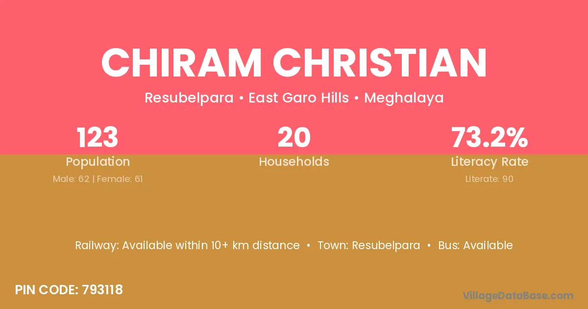 Chiram Christian village has a total population of 123 people, of which 62 are males and 61 are females.