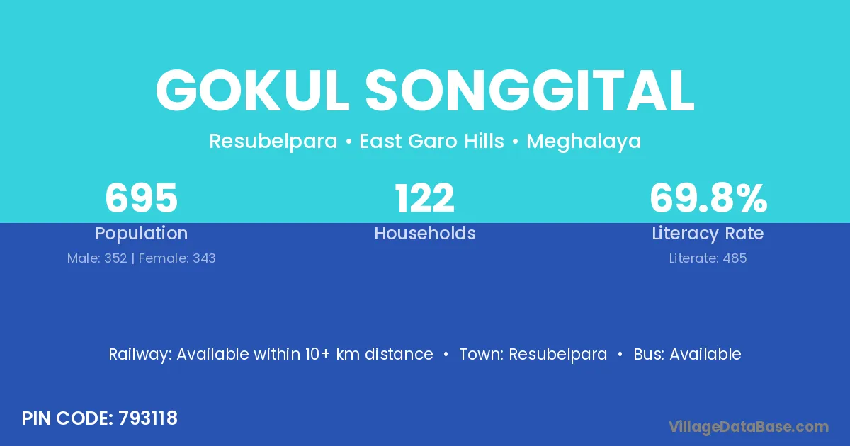 Gokul Songgital village has a total population of 695 people, of which 352 are males and 343 are females.