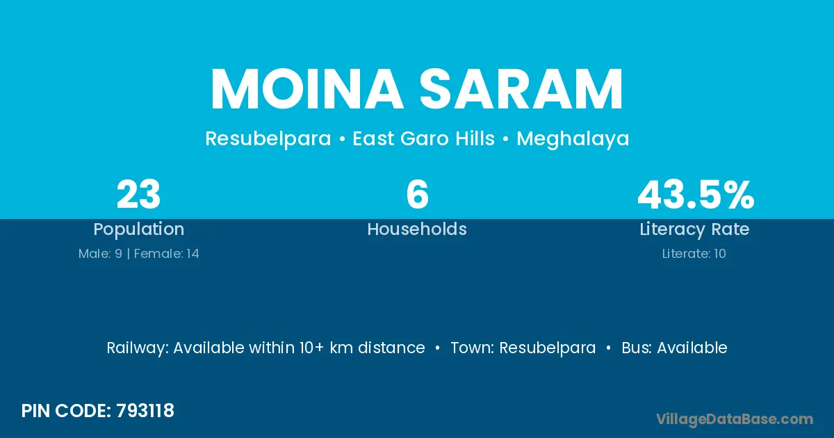 Moina Saram village has a total population of 23 people, of which 9 are males and 14 are females.