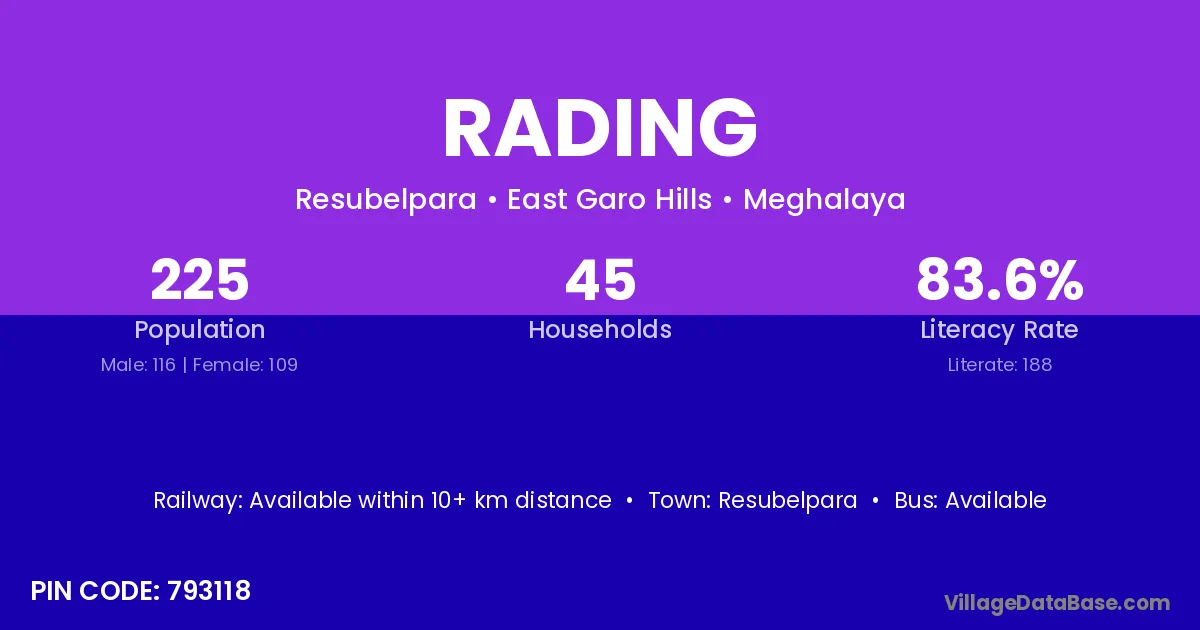 Rading village has a total population of 225 people, of which 116 are males and 109 are females.