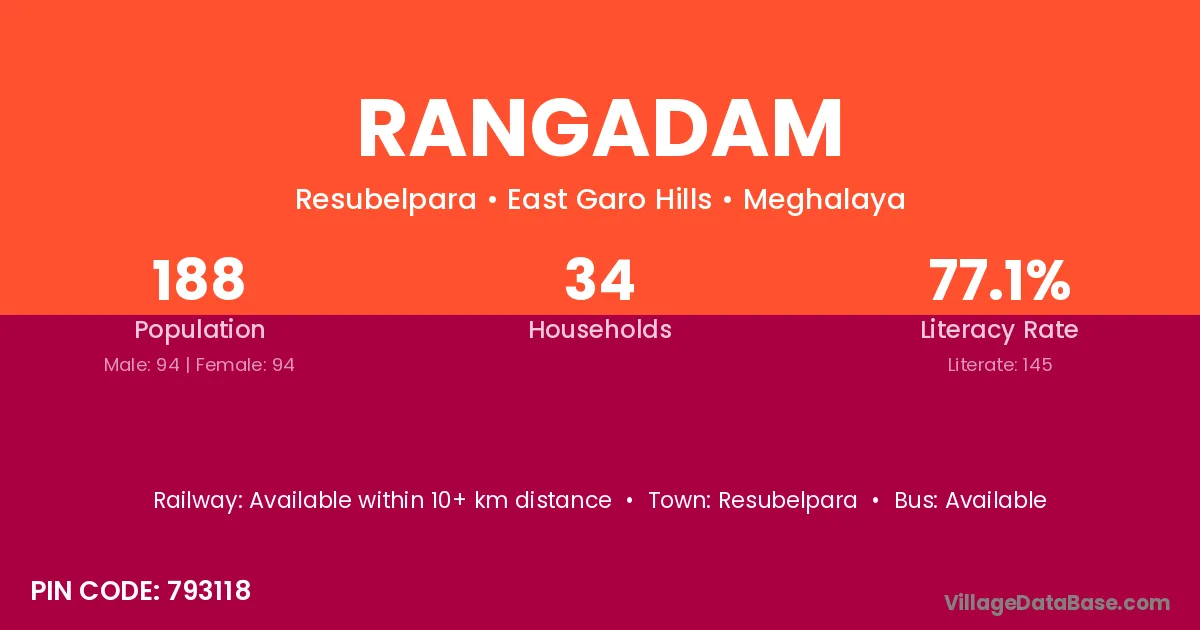 Rangadam village has a total population of 188 people, of which 94 are males and 94 are females.
