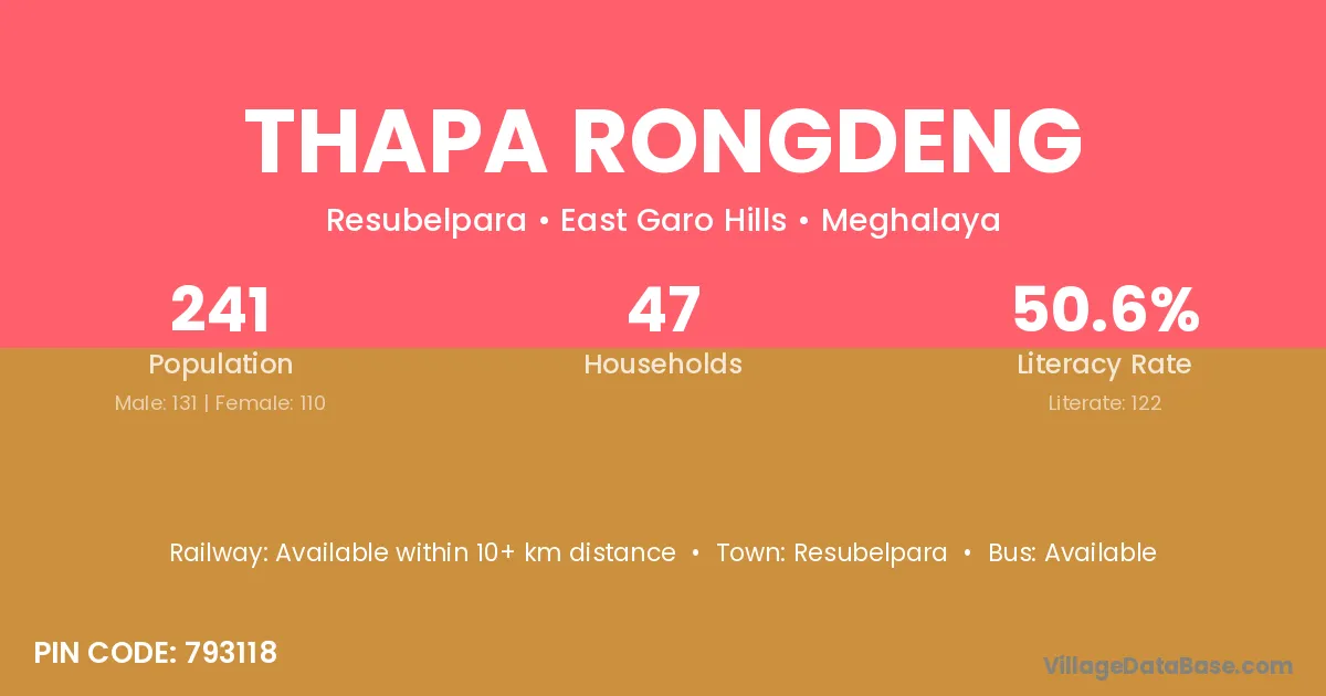 Thapa Rongdeng village has a total population of 241 people, of which 131 are males and 110 are females.