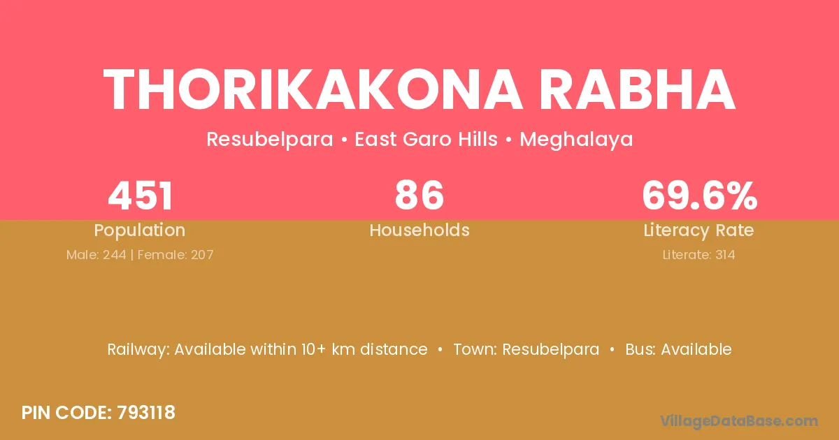 Thorikakona Rabha village has a total population of 451 people, of which 244 are males and 207 are females.