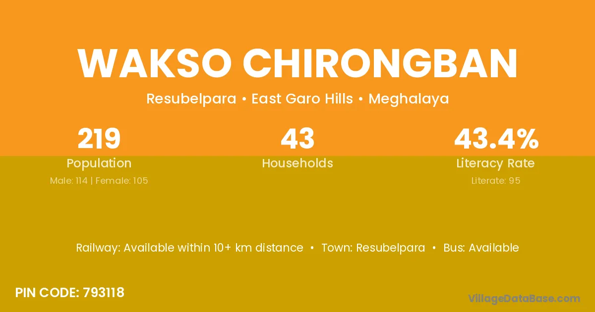 Wakso Chirongban village has a total population of 219 people, of which 114 are males and 105 are females.